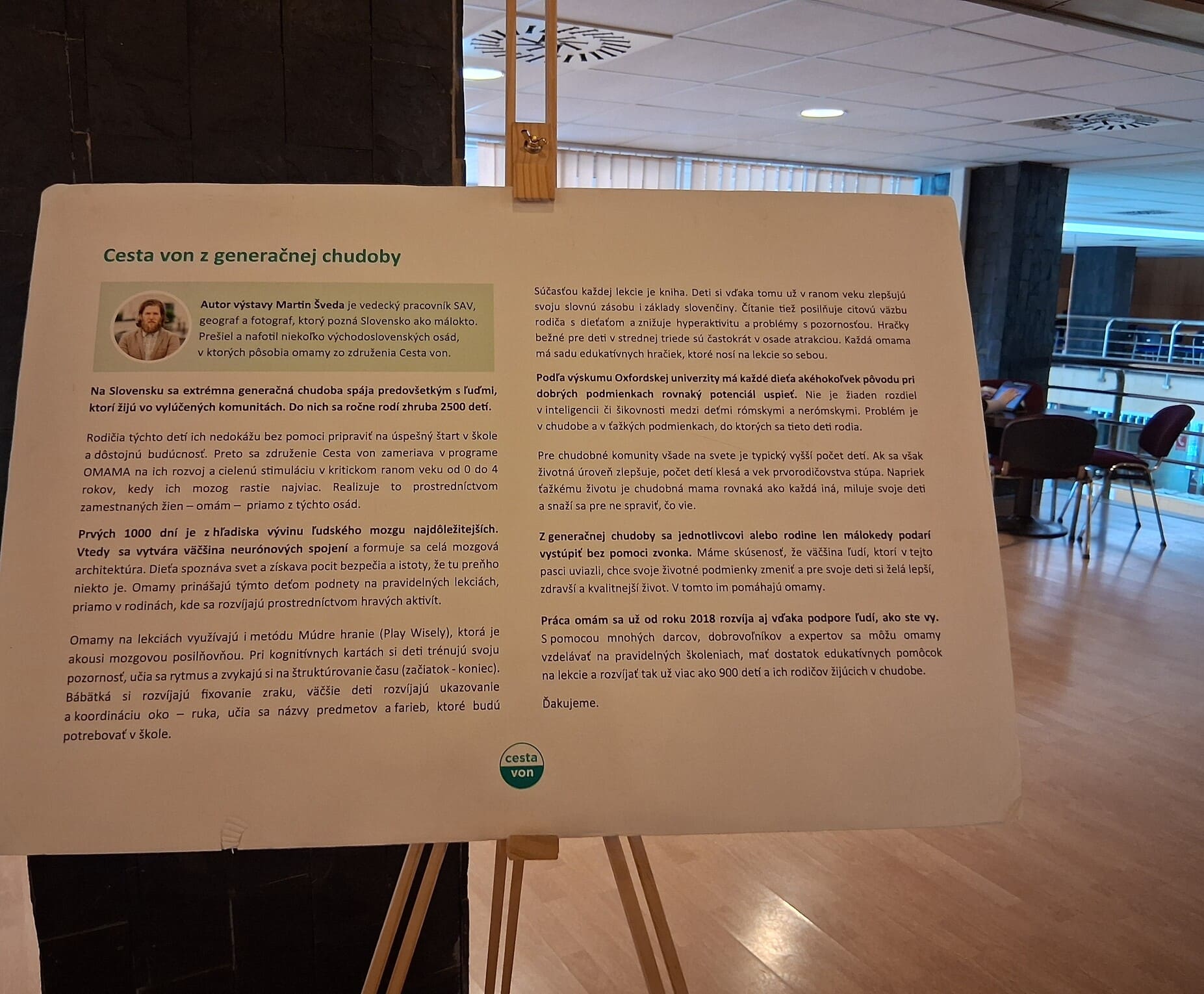 Katedra filozofie a politológie Filozofickej fakulty Univerzity Konštantína Filozofa v Nitre srdečne pozýva na dokumentárnu výstavu, ktorá pútavým spôsobom mapuje činnosť občianskeho združenia Cesta von v úspešnom projekte sociálnej inklúzie Omama. Jedinečná inštalácia pod názvom Omama: cesta von z generačnej chudoby sa tematicky zameriava na rozvojový program sociálnej intervencie v marginalizovaných komunitách na Slovensku. Projekt Omama cieli ku kvalitatívnej zmene života detí v raných štádiách ich vývinu, pričom významne kontaktuje aj pôvodné rodičovské prostredie. Omama formou návštev v domácnostiach podporuje zdravý kognitívny, sociálny a psychomotorický vývin rómskych detí žijúcich v generačnej chudobe počas najkritickejšieho obdobia v živote dieťaťa (0-3 rokov). Návštevy v rodinách zasiahnutých generačnou chudobou vykonávajú vyškolené rómske ženy (omamy) pochádzajúce z vylúčených komunít. Týmto sú sami posilňované, aby sa stali súčasťou riešenia generačnej chudoby.