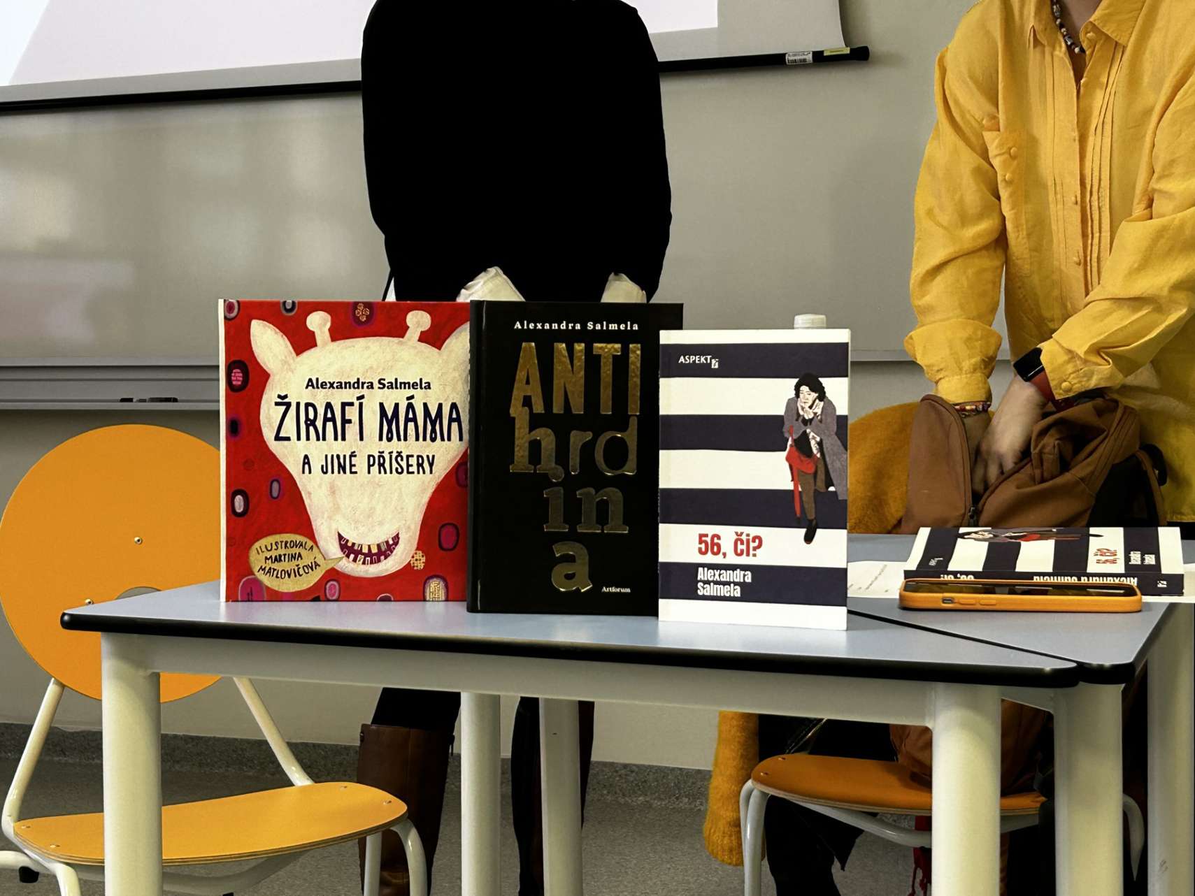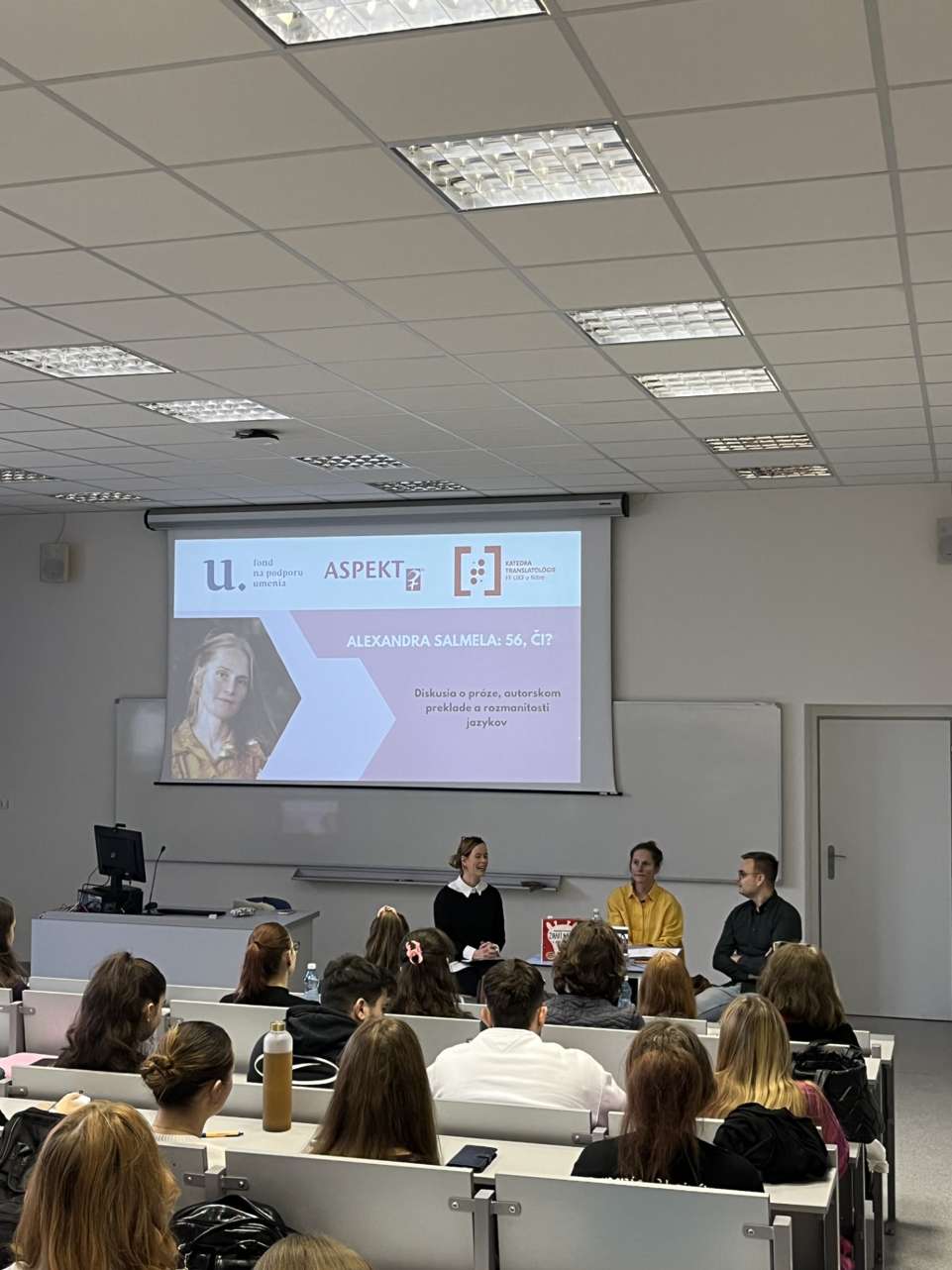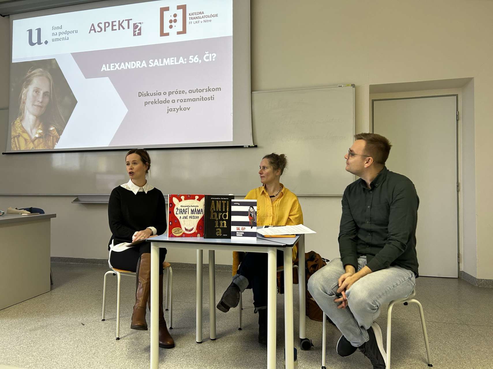 Alexandra Salmela porozprávala študentom a študentkám o svojej ceste k jazykom a štúdiu fínčiny a prezradila im rôzne špecifiká či prekvapenia, ktoré so sebou fínčina a fínska kultúra nesú. Hlavnou témou diskusie bola však autorkina kniha 56, či?, ktorú pôvodne napísala vo fínčine. Vďaka diskusii sa študentstvo dozvedelo o procese písania vlastnej knihy, ale i o autorskom preklade a výzvach, ktoré so sebou prináša. Reakcie a otázky z publika potvrdili, že diskusia bola mimoriadne zaujímavá a prínosná z translatologického i literárnovedného hľadiska.