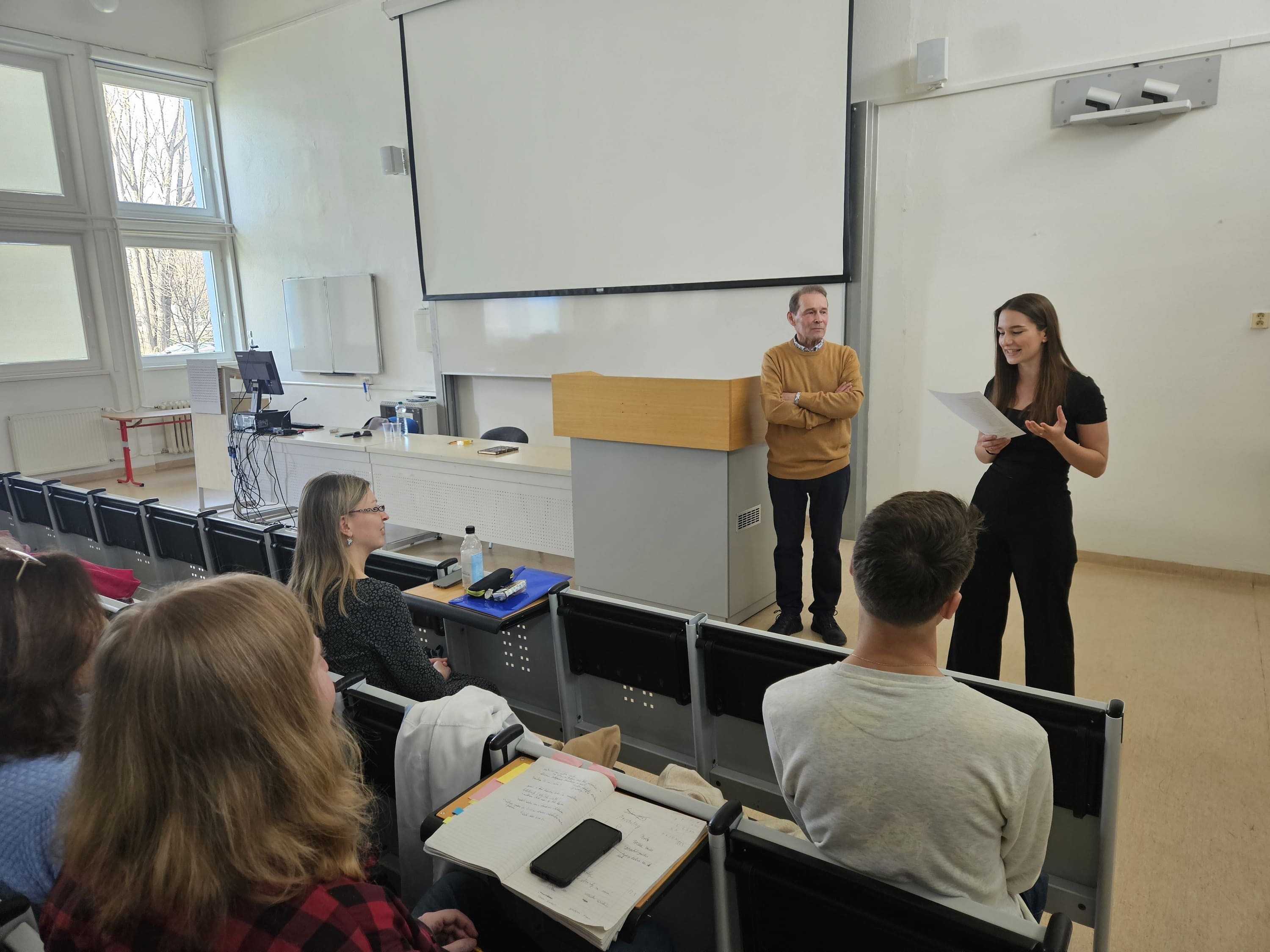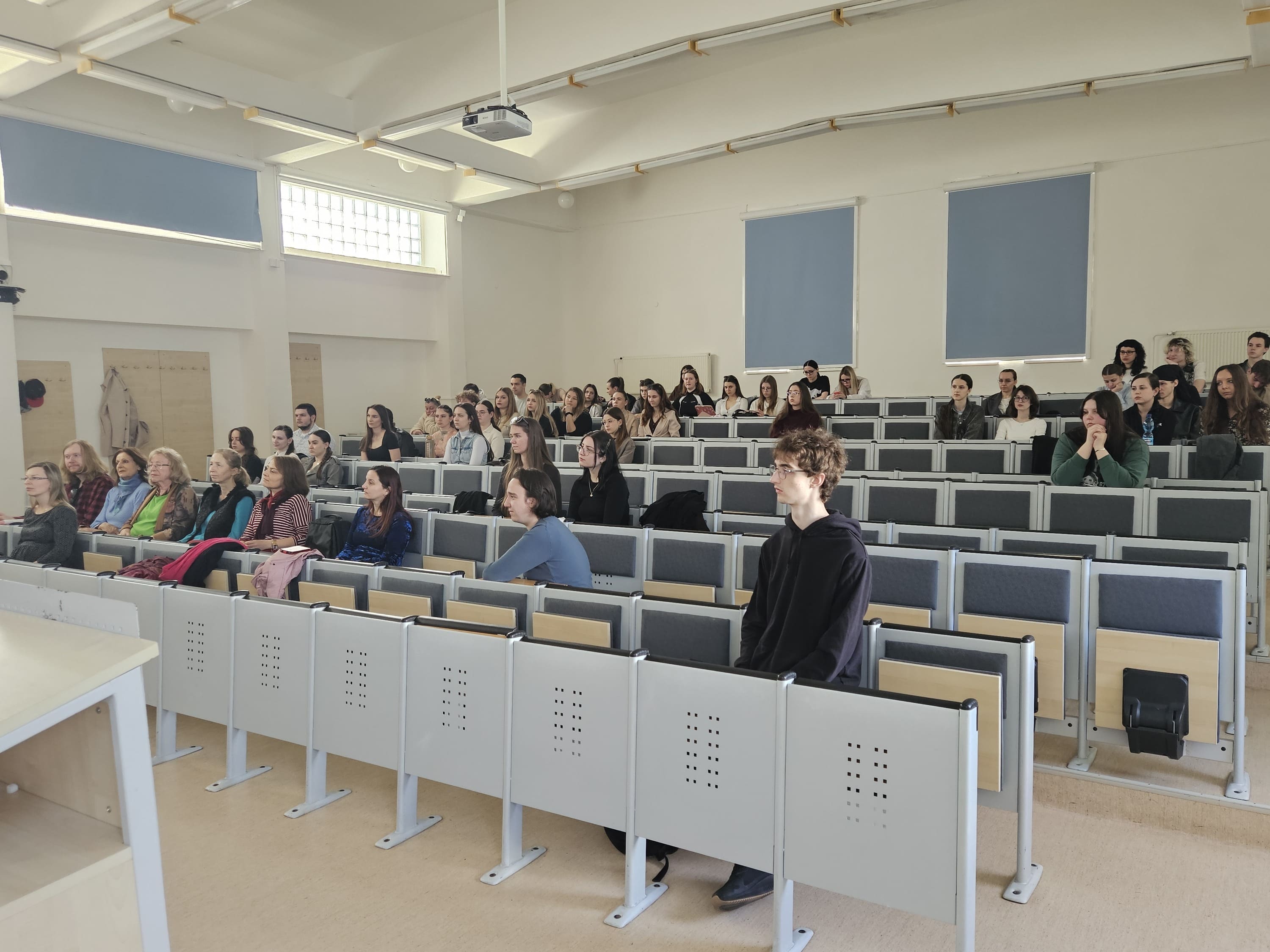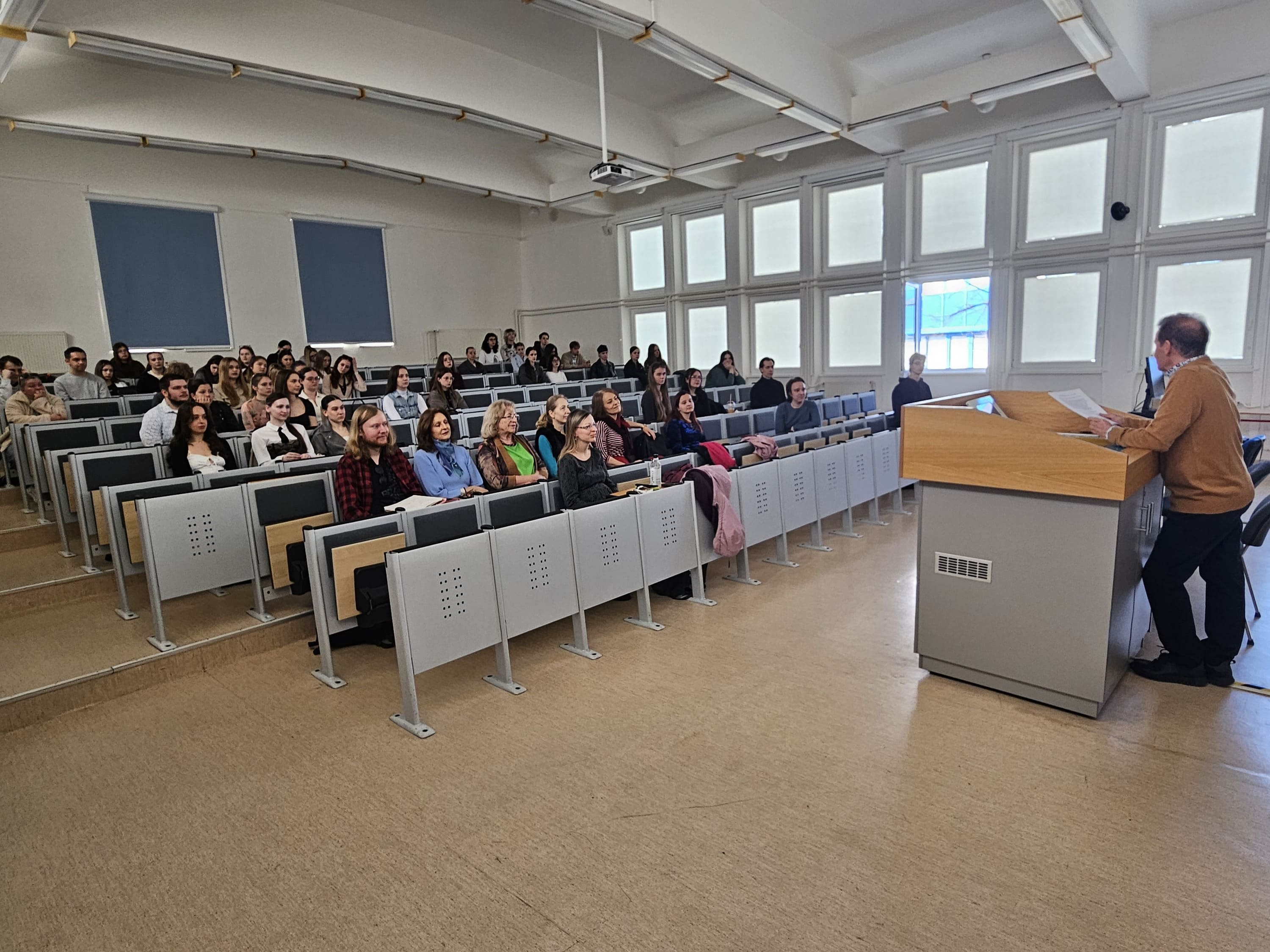 Dňa 12.3. 2026 k nám na pozvanie Katedry anglistiky a amerikanistiky FF UKF v Nitre zavítal známy a charizmatický slovenský herec Ján Gallovič. Pútavo a zanietene porozprával o tom, čo všetko zahŕňa proces premeny umeleckého diela z textu na papieri na predstavenie na javisku, o rôznych aspektoch hercovej prípravy na uchopenie svojej roly — od jazykovej a pohybovej po mentálnu a emocionálnu prípravu. Hovoril tiež o tom, ako je možné tieto herecké schopnosti a skúsenosti využiť aj v iných povolaniach, zdôrazňujúc najmä to učiteľské. Jeho prednáška bola taká zaujímavá a podnetná, že sme sa ani nenazdali, ako rýchlo ubehol čas, pričom pán Gallovič ani nestihol odprezentovať všetko, čo mal v pláne. Dúfame teda, že ho na našej akademickej pôde budeme môcť v skorej budúcnosti opäť privítať.