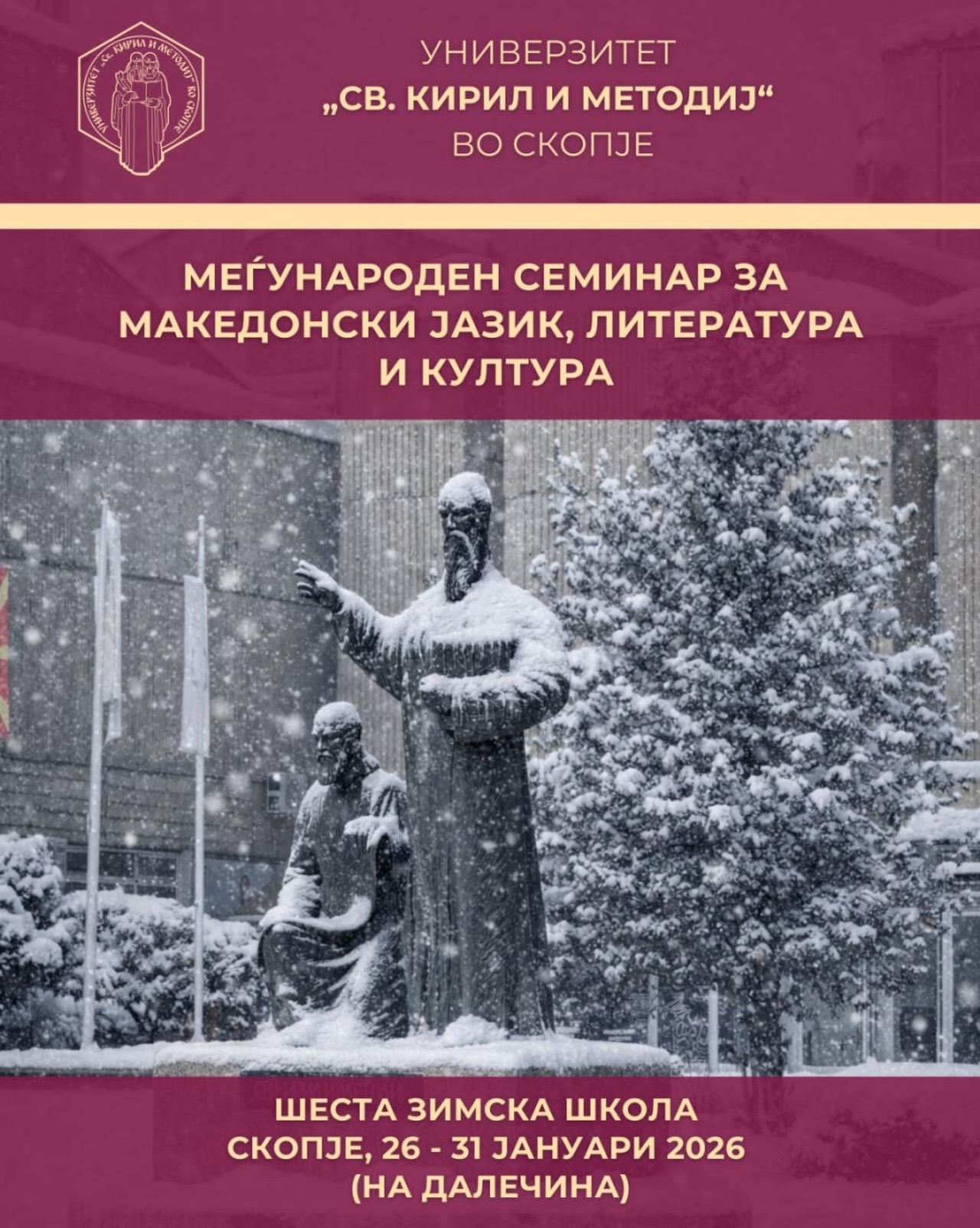 V dňoch od 26. do 31. januára 2026 sa konal šiesty ročník Zimnej školy macedónskeho jazyka, kultúry a literatúry, ktorého sa aktívne zúčastnili študenti/-ky a akademickí pracovníci zo všetkých strán sveta (napr. Albánsko, Austrália, Bulharsko, Čína, Chorvátsko, Kanada, Maďarsko, Rumunsko, Poľsko, Srbsko, Slovinsko, Rusko, Slovensko, Taliansko, Turecko, Ukrajina, USA a iné). Podujatie organizuje Medzinárodný seminár macedónskeho jazyka, literatúry a kultúry Univerzity sv. Cyrila a Metoda v Skopje formou online videohovorov.